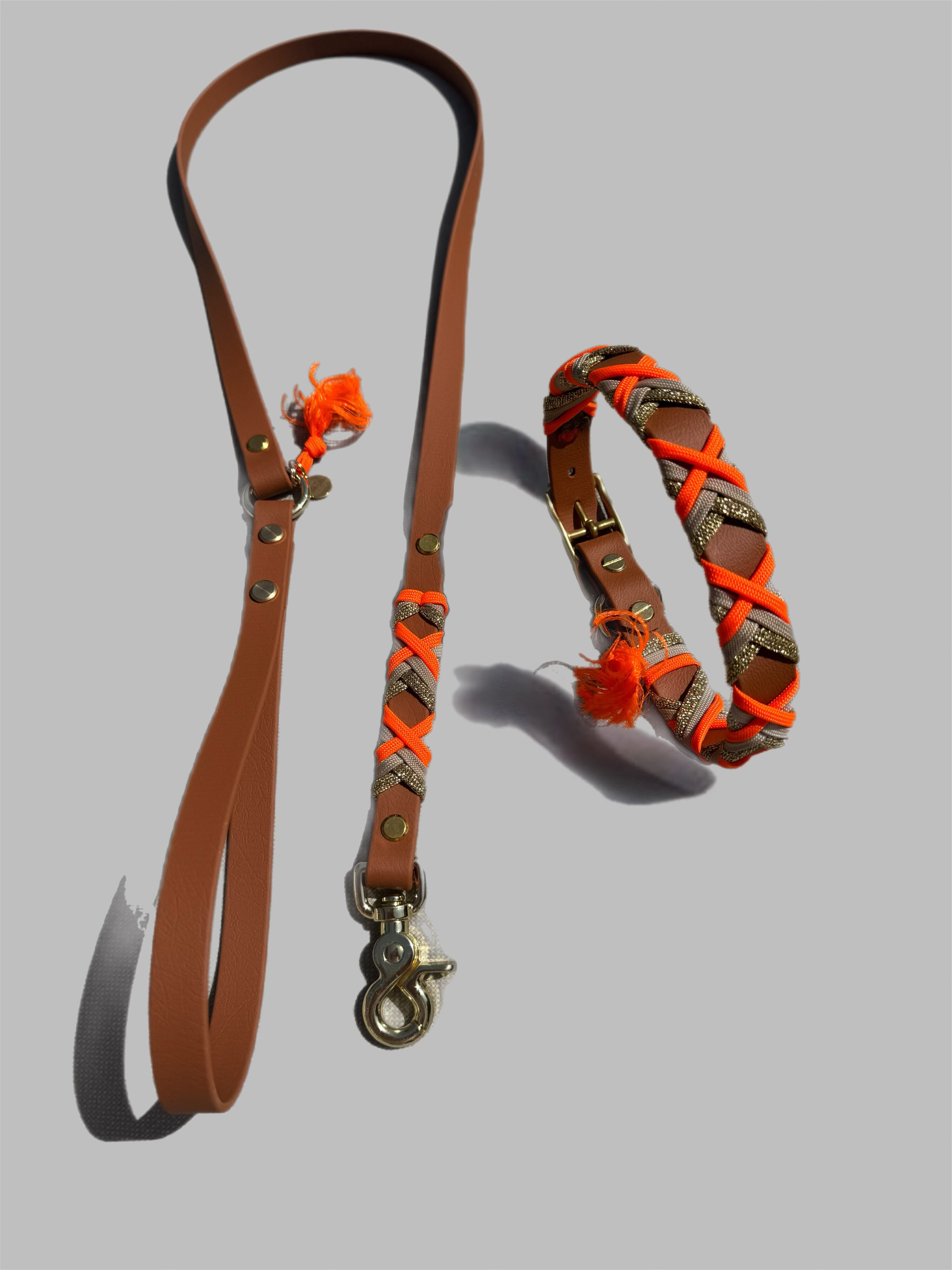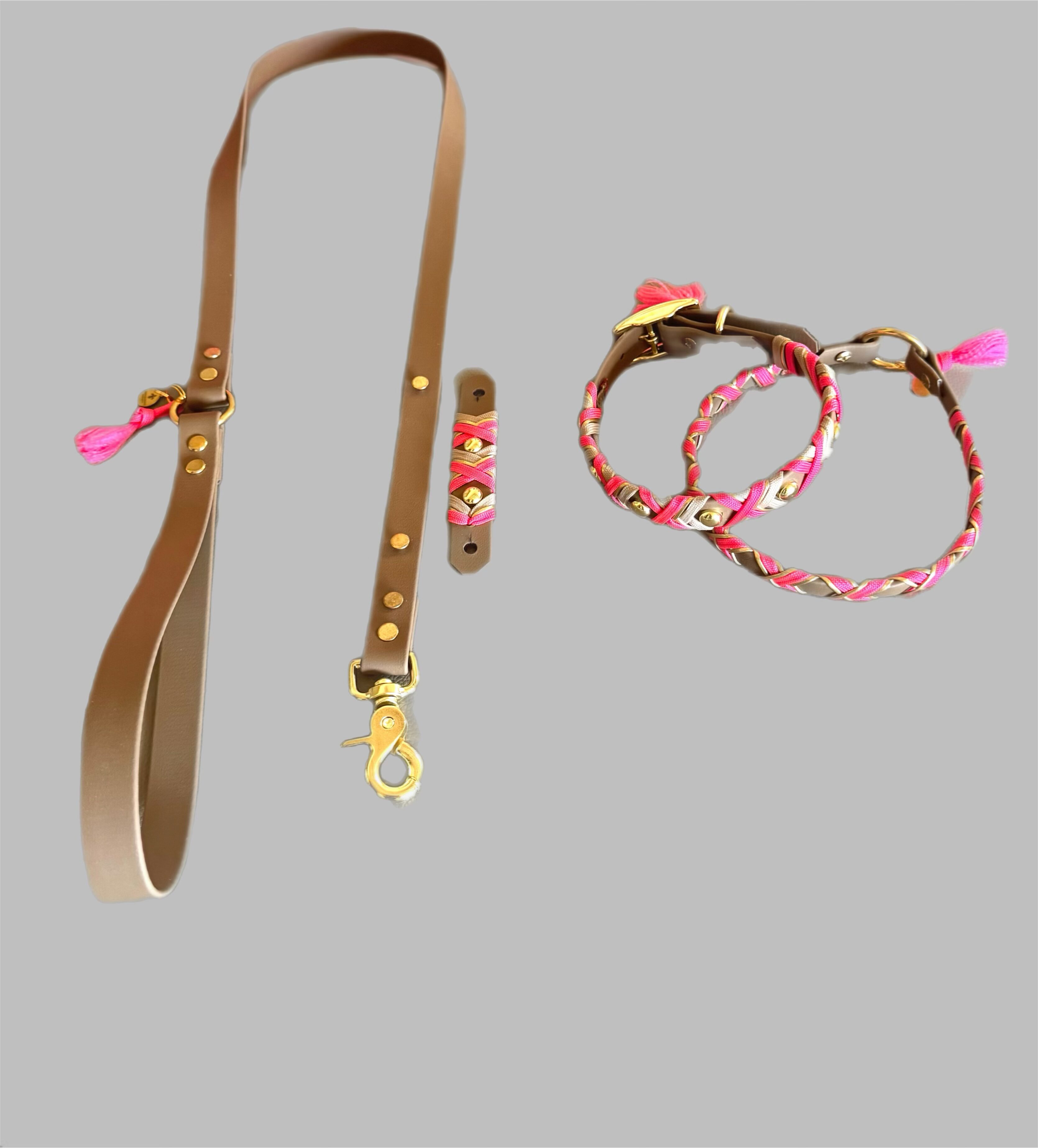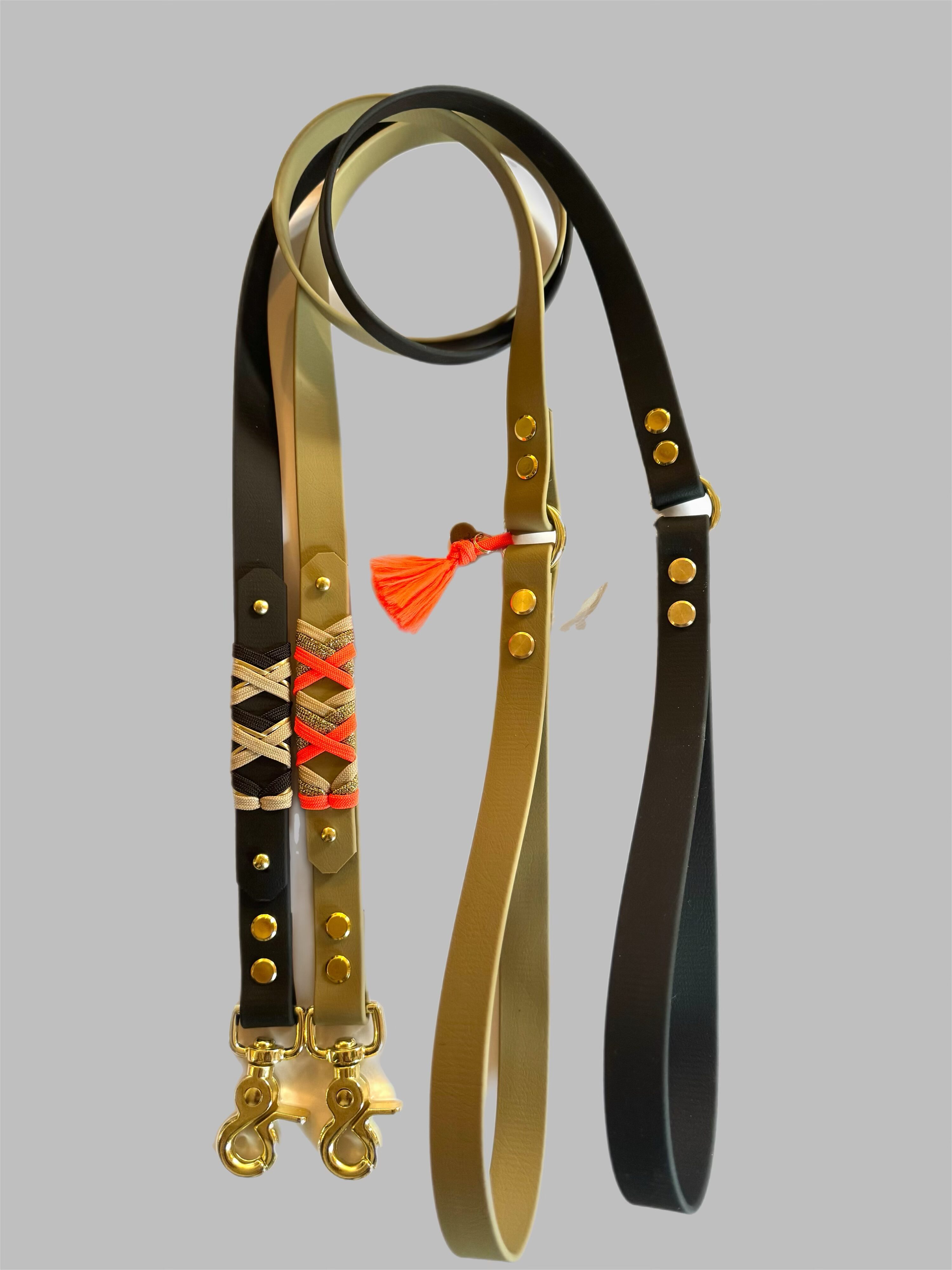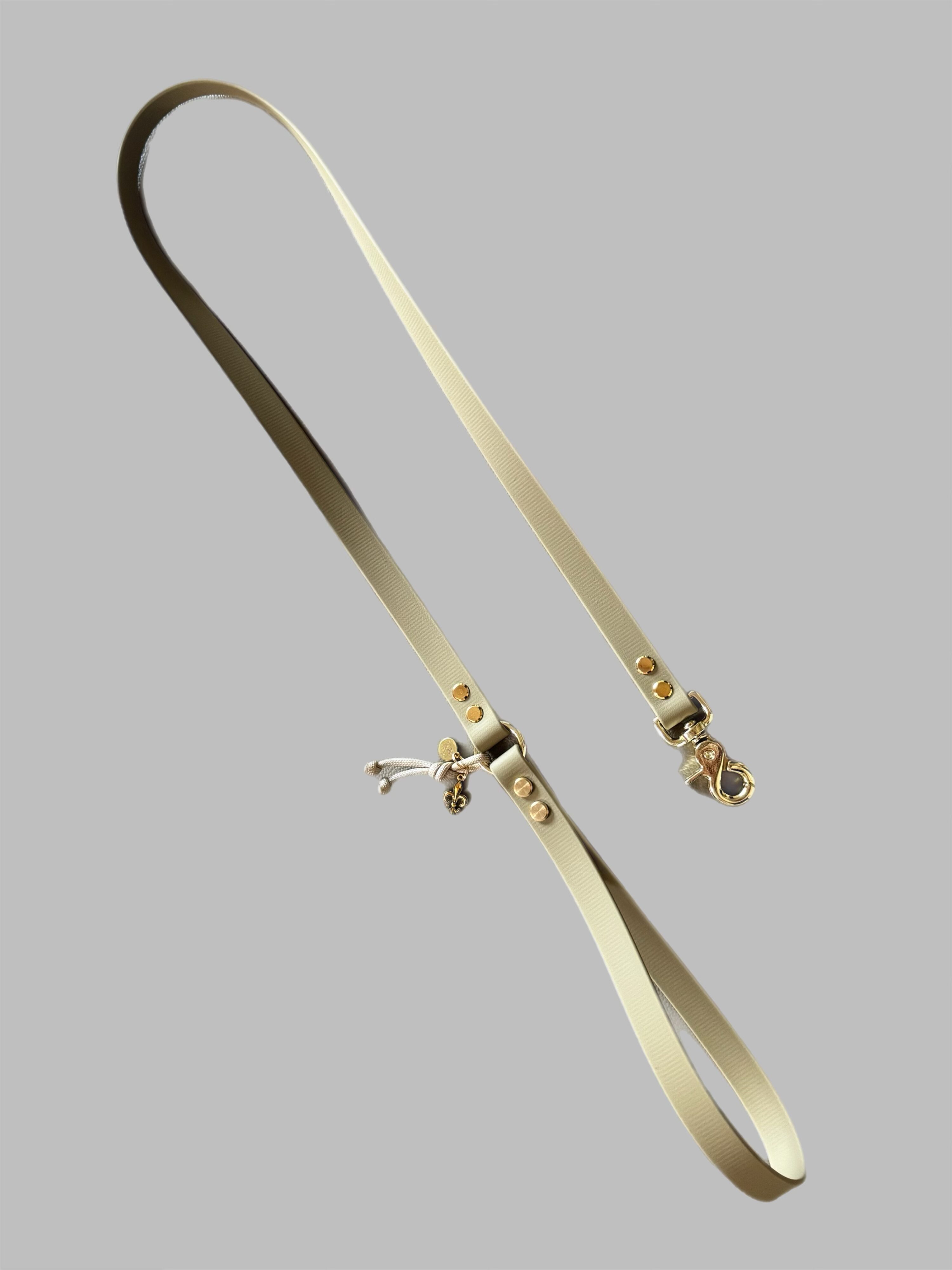 Der hochwertige Scherenkarabiner mit Wirbel in Gold sorgt für sichere Führung und passt perfekt zum Look. Ein besonderer Akzent: Der abnehmbare Stripe in der Farbe deines Halsbandes – inklusive bei jeder Leine und auch separat erhältlich, wenn du farblich variierst.