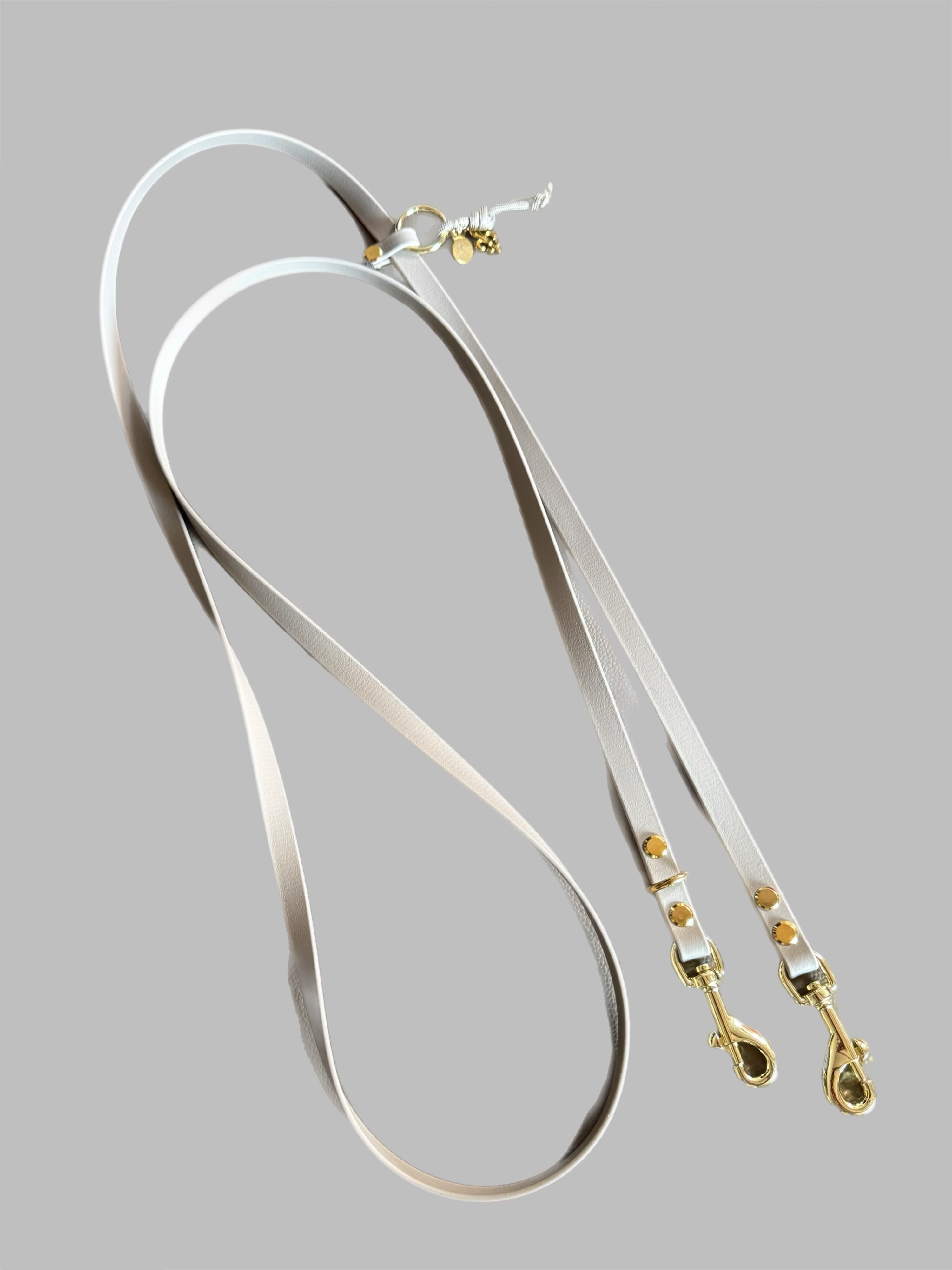 Ob lässig über der Schulter, entspannt um die Hüfte oder klassisch in der Hand – die Flexline Gold passt sich deinem Leben an. Mit zwei goldenen Wirbelkarabinern und einem stufenlos verstellbaren Schieber lässt sich die Leine ganz flexibel tragen: als Crossbody, handsfree oder verkürzt für mehr Nähe im Alltag.
